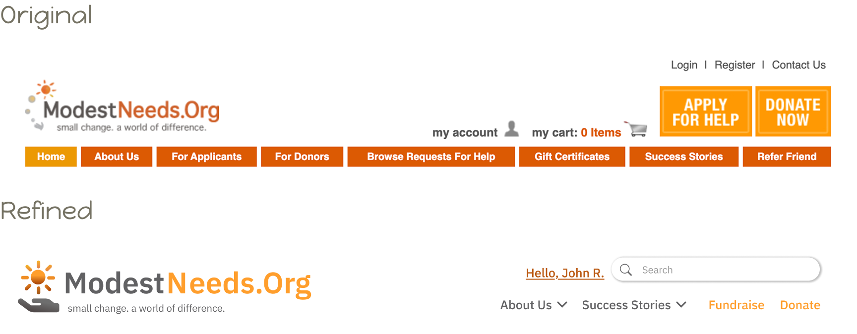 The Modest Needs website was outdated and difficult to use. It had confusing navigation and failed to clearly communicate the organization’s mission and services. These issues created barriers for both donors and applicants resulting in low engagement, reduced donations, and missed opportunities to support individuals in crisis.
